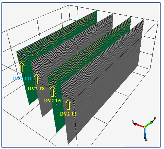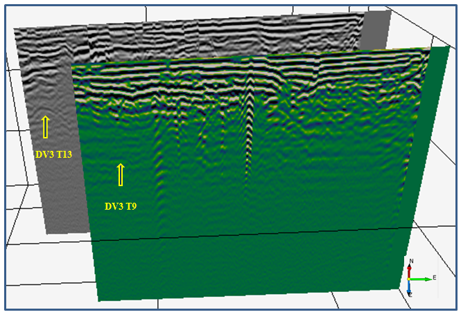 Dị vật 3 có tín hiệu kéo dài từ tuyến T9 đến tuyến T13 có thể là một đường ống hoặc cáp kéo dài, cách đầu mỗi tuyến đo khoảng từ 11,32 m đến 15,92 m; thời gian tín hiệu phản xạ trên các tuyến 10 ns độ sâu dị vật khoảng 0,5 m (với vận tốc truyền sóng ước tính 0,1m/ns). Tuy nhiên, trong khi thu thập số liệu, dị vật DV3 có thể hiện trên các tuyến T10, T11 nhưng không rõ lắm. Liên kết các tuyến lại dự đoán được đường đi của DV3 cắt ngang các tuyến T10 và T11. Như vậy, hình ảnh mô tả vị trí DV3 được thể hiện rõ nét nhất trong Figure 9 với các tuyến T9, T13. Các thống kê chi tiết vị trí xuất hiện theo từng tuyến của DV3 thu được mô tả chung trong Table 2 .