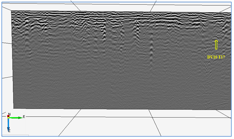 Các dị vật có khả năng là những đối tượng có kích thước nhỏ, nằm riêng lẻ như DV6, DV7, DV8, DV9 và DV10 được thể hiện rõ trong các mặt cắt 2D của từng tuyến. Ở đây, chúng tôi trình bày lát cắt của tuyến T17, trên tuyến này xuất hiện DV10 ( Figure 12 ).